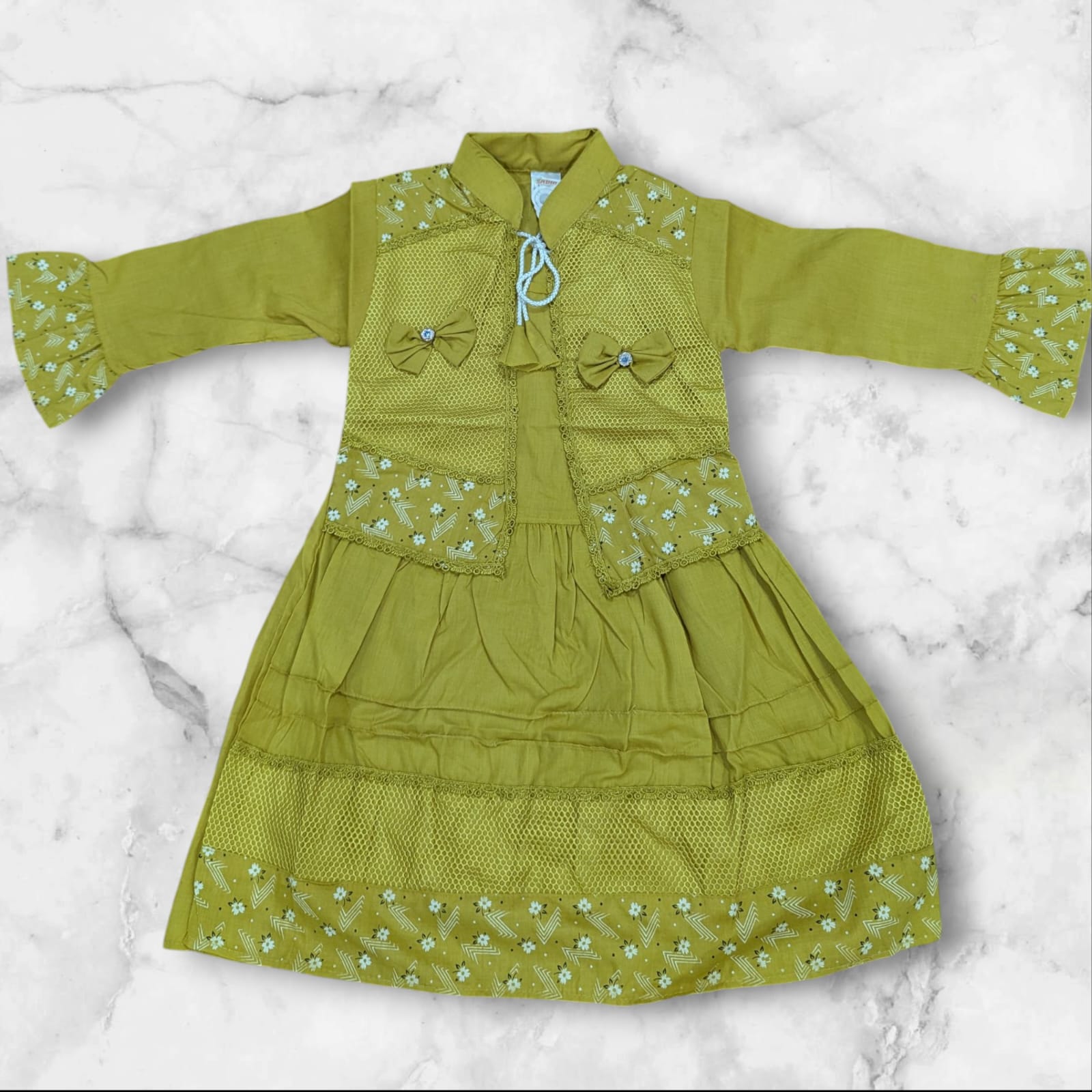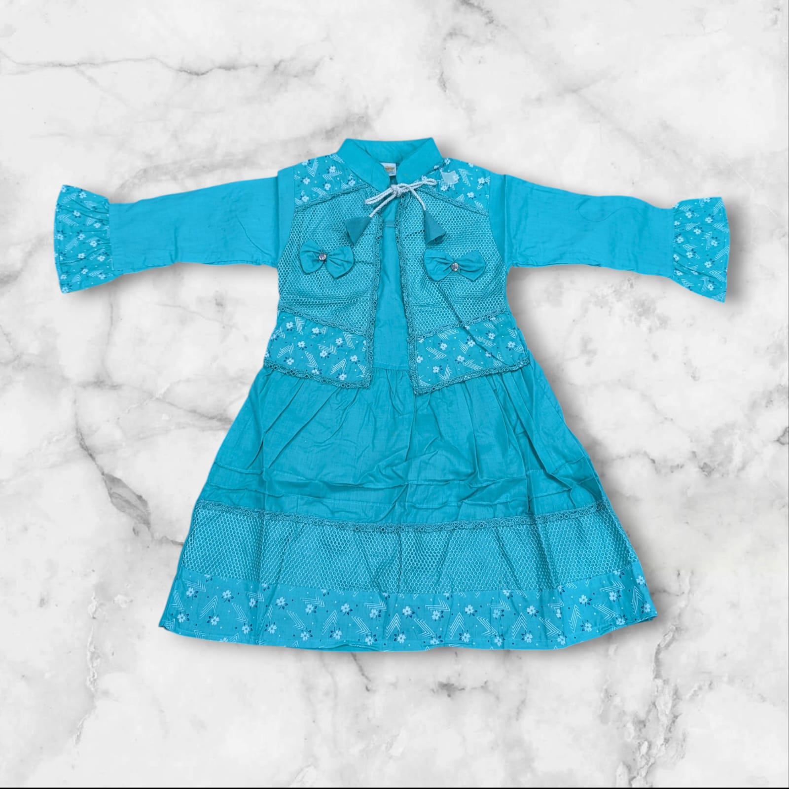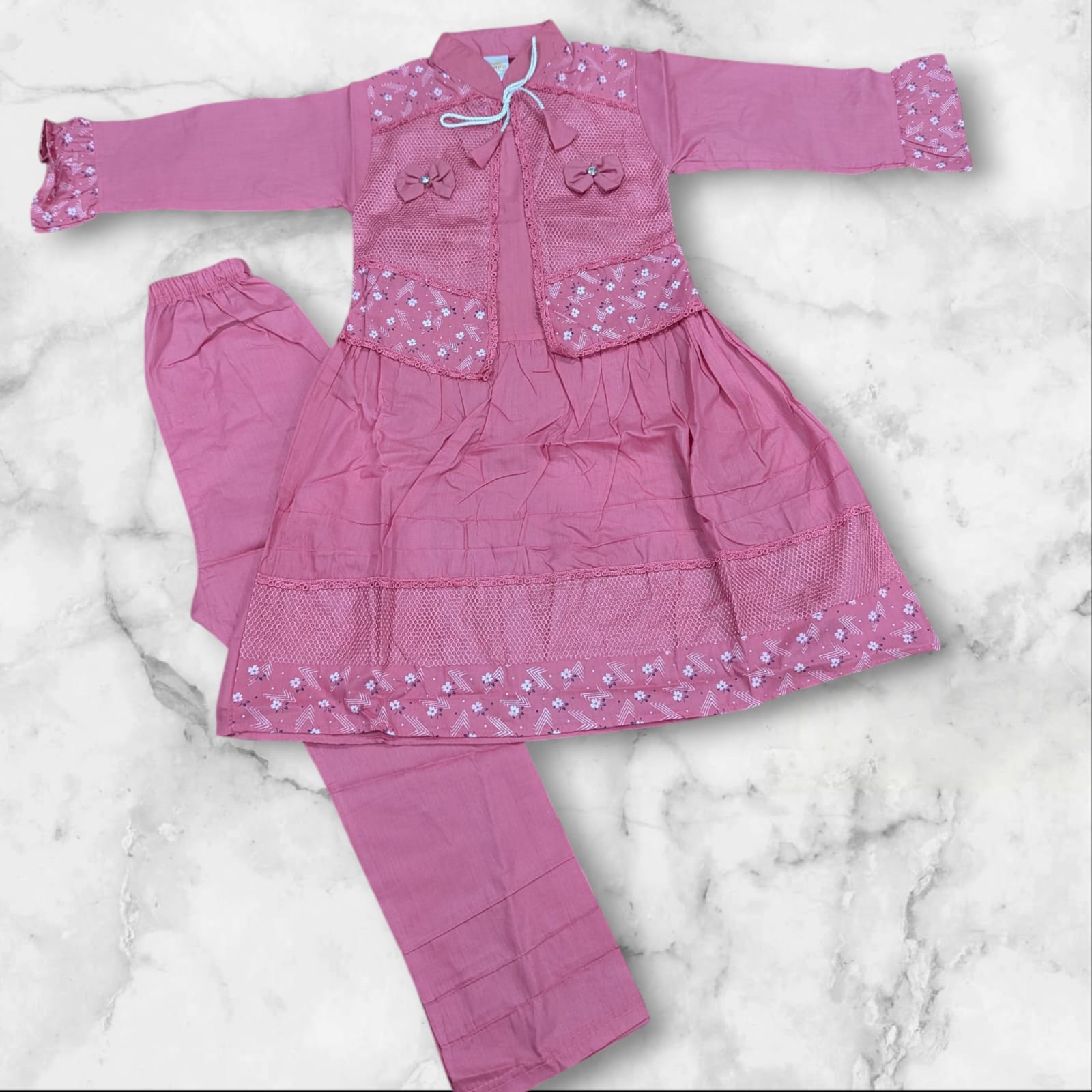 Give your little girl a blend of comfort and tradition with our Stylish Girls Ethnic Kurti Pant Set. This beautiful set includes a full-sleeve kurti with adorable detailing like front bows, lace accents, and printed cuffs, paired with matching elastic-waist pants for easy wear.